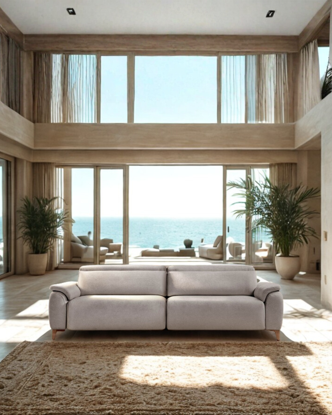 Aquest sofà per defecte tindrà en tots els seus mòduls de seient el mecanisme lliscant de carro a terra, tindrem l'opció que aquests siguin lliscants de carro a terra amb motor elèctric i botonera.